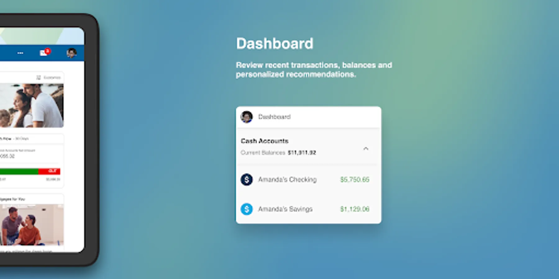 Custom Dashboard - Manage all of your accounts in one easy-to-view dashboard. View available funds, the progress of savings goals, upcoming payments, how much you’ve deposited, rewards you’ve earned, and personal recommendations all in one simple and easy-to-read screen. You’ll also have the ability to check your credit score.