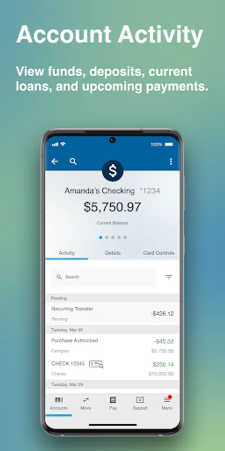 Accounts - View and manage all of your savings accounts, loans, and credit cards digitally. Review recent transactions, see current balances, and search for specific payments or deposits.