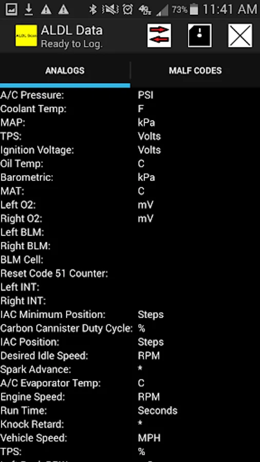 ALDL Scan is an app for viewing ALDL data from 1995 and older GM vehicles. It can be used to view Analog parameters, Malfunction codes, or resetting the vehicle's ECM. ALDL Scan also provides for the recording of ALDL data to the user's Android device. ALDL Scan must be used in conjunction with the Bluetooth car adapter from 1320 Electronics. ALDL Scan is not compatible with other Bluetooth car adapters.