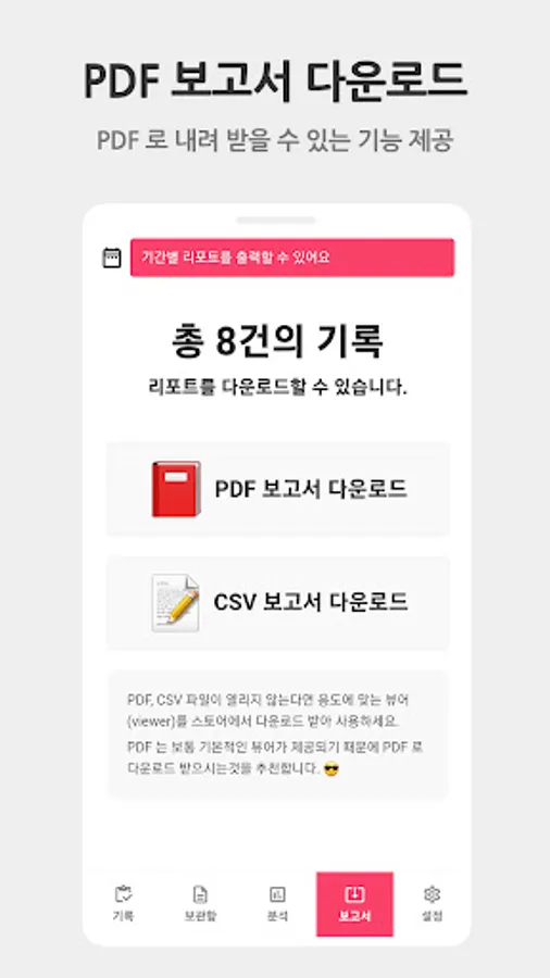 (PDF reports can be downloaded, CSV files can be sent/shared/downloaded)