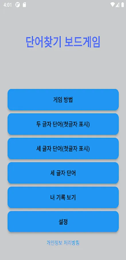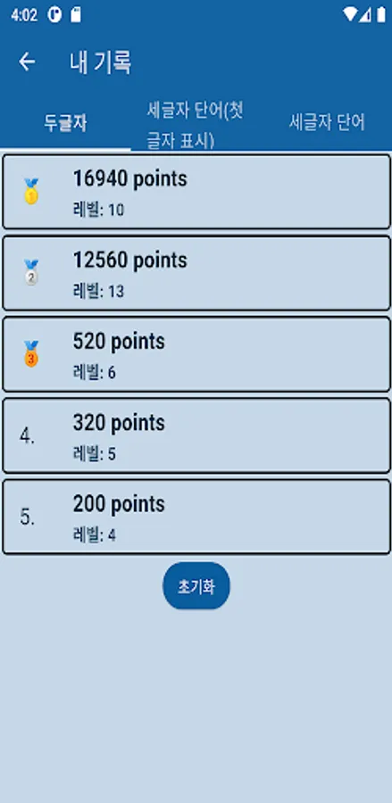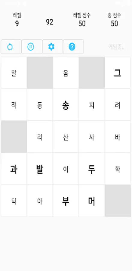 It is a game to empty the board by pressing a two-letter Korean word (noun) or a three-letter Korean word consecutively. For example, in a two-letter game, if you touch school and school consecutively, you enter school, and if the word exists on the problem board, the corresponding 2 tiles will be erased from the game board. Each time you get one word right, you get a set score for each step, and in a level with a time limit, the remaining time is also counted toward the score. nThere are two-letter mode and three-letter word mode, and in the three-letter word mode, there is an additional game mode that displays the first letter. The number of tiles on the board varies in each step, and there is a time limit from step 8, so you must empty all the boards within this time to proceed to the next step.