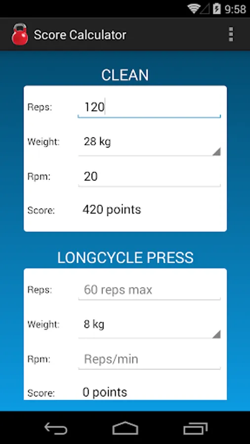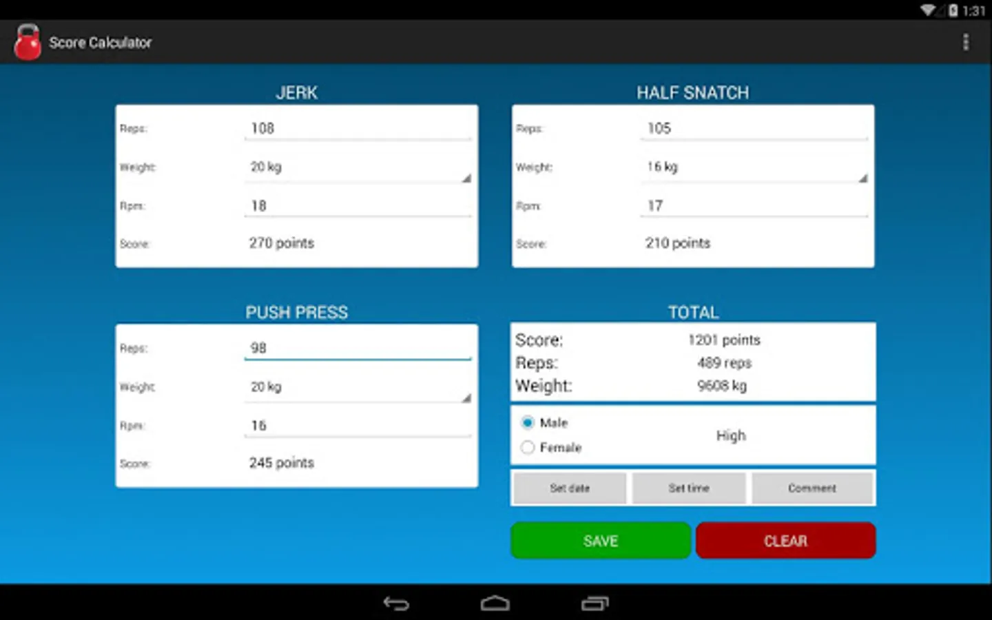 This app is a Score Calculator and Timer for Kettlebell Pentathlon. Use it to plan your pentathlon and track your results.