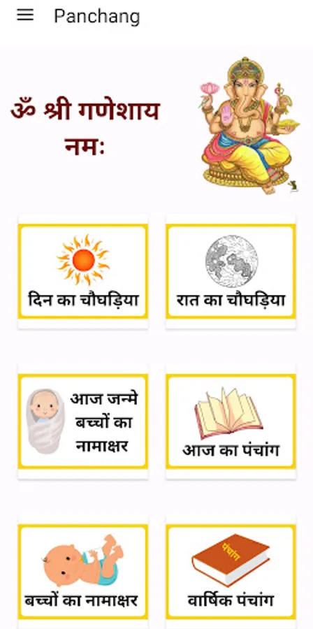 पंचांग app के माध्यम से आप पंचांग, चौघड़िया, बच्चों का नाम अक्षर, व्रत कथा , ज्योतिष की जानकारी इत्यादि देख सकते हैं
