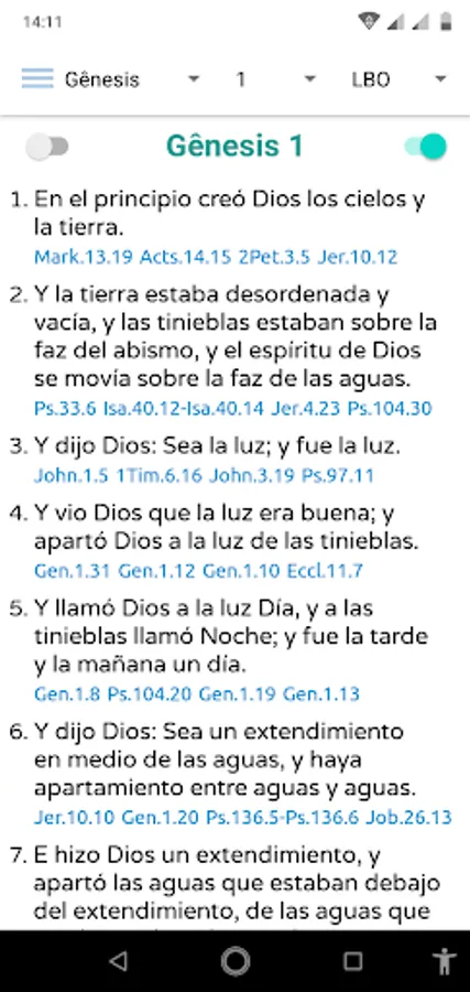 Study Bible with Cross Reference offers users the ability to navigate to related biblical texts, compare interpretations between two versions of the Bible, use dark mode, and toggle related texts. Currently, the supported versions of the Bible are the Bear Bible version and the Reina-Valera version. Offline support is also possible.