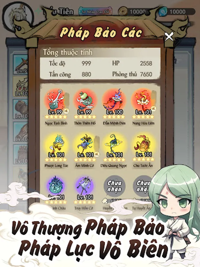 Ở đây, Pháp Bảo Huyễn Hải Châm, Phược Long Tác, Chu Tước Ấn đều BUFF thuộc tính cao cấp