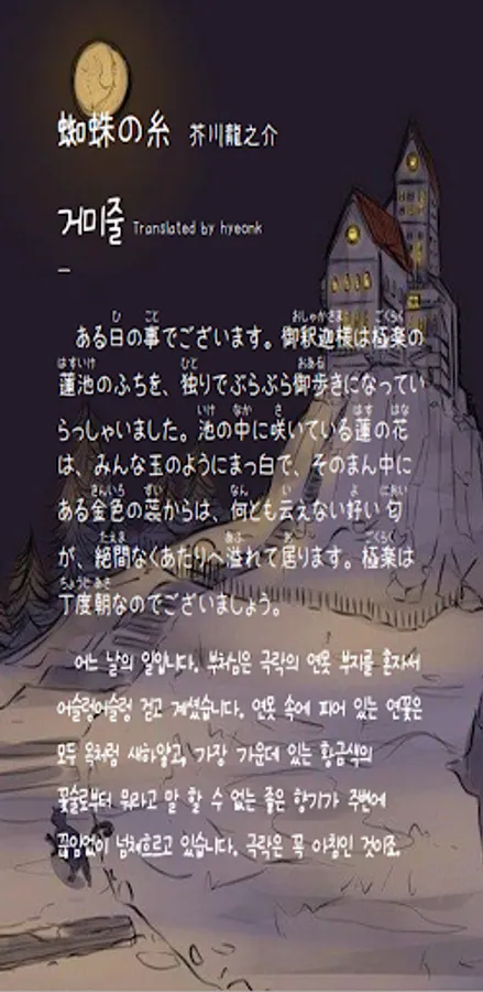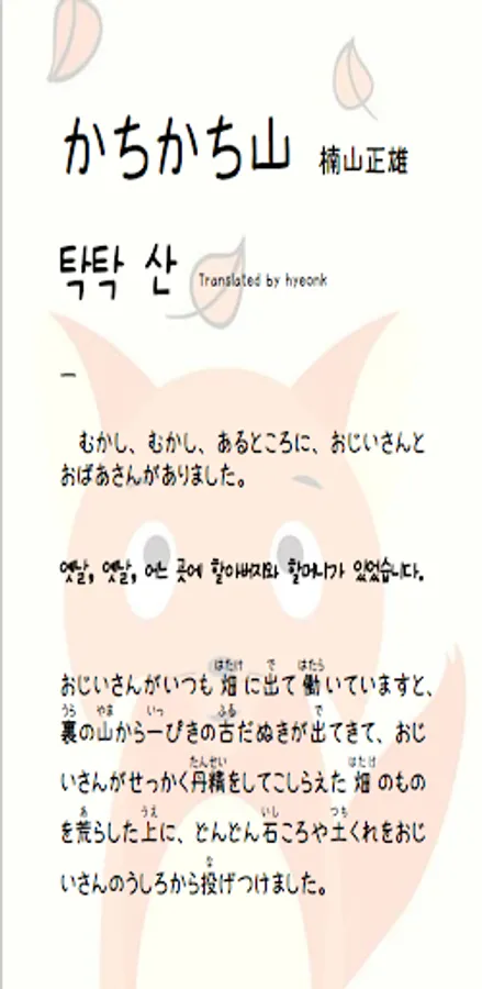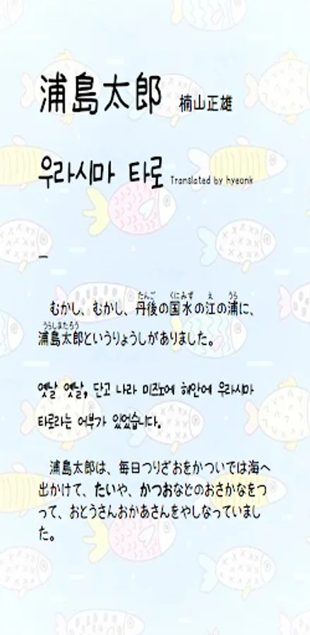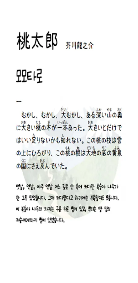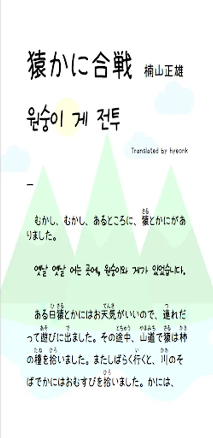 It was created by selecting popular stories from traditional Japanese fairy tales that Japanese people love. (桃太郎、Kachikachiyama、蜘蛛の糸, etc.) These works are understood by the Japanese and can be a window of communication. Learn Japanese in a fun and easy way through the flow of the story rather than recklessly memorizing it!