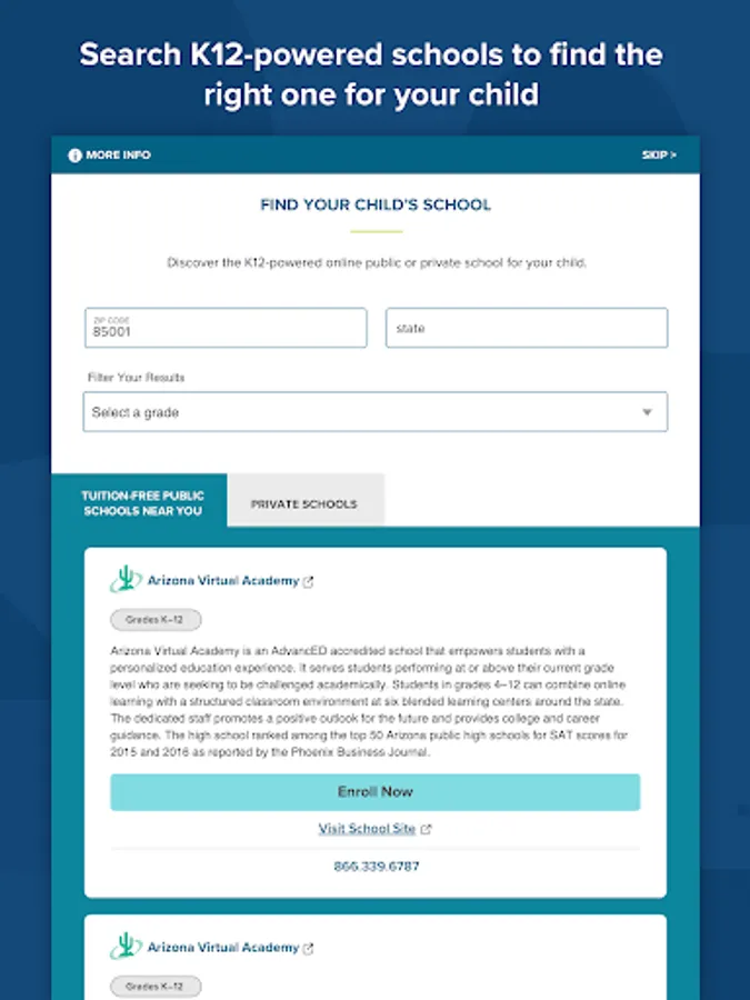 Simply type in your zip code or state to see a list of K12-powered schools near you.