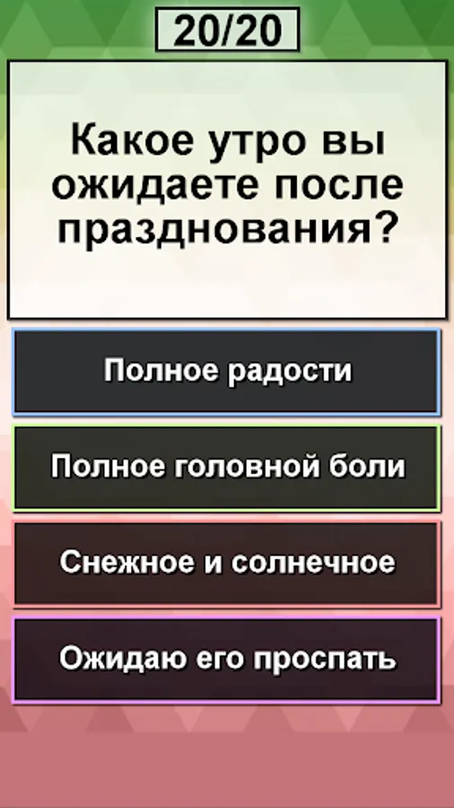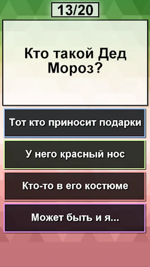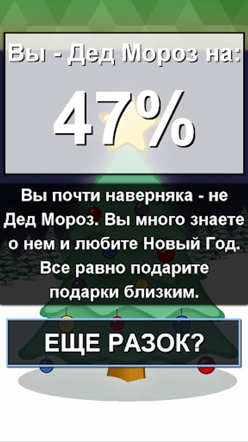 The test verifies exactly your dedomorozovost, and not knowledge of the traditions of the new year. The results are calculated as objectively as possible (albeit in a comic form), but the application primarily has an entertaining function. Even if according to the results of the test - you are probably Santa Claus, consult a specialist in antifreeze :-)))