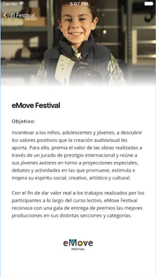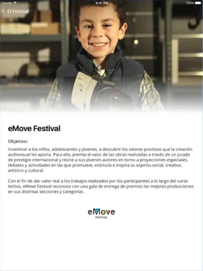 eMove Festival is the official app of the University School Festival and Audiovisual Arts. Here you will find the most relevant festival information, news, jury, sponsors ... and most importantly you will see all videos participants and winners sections: