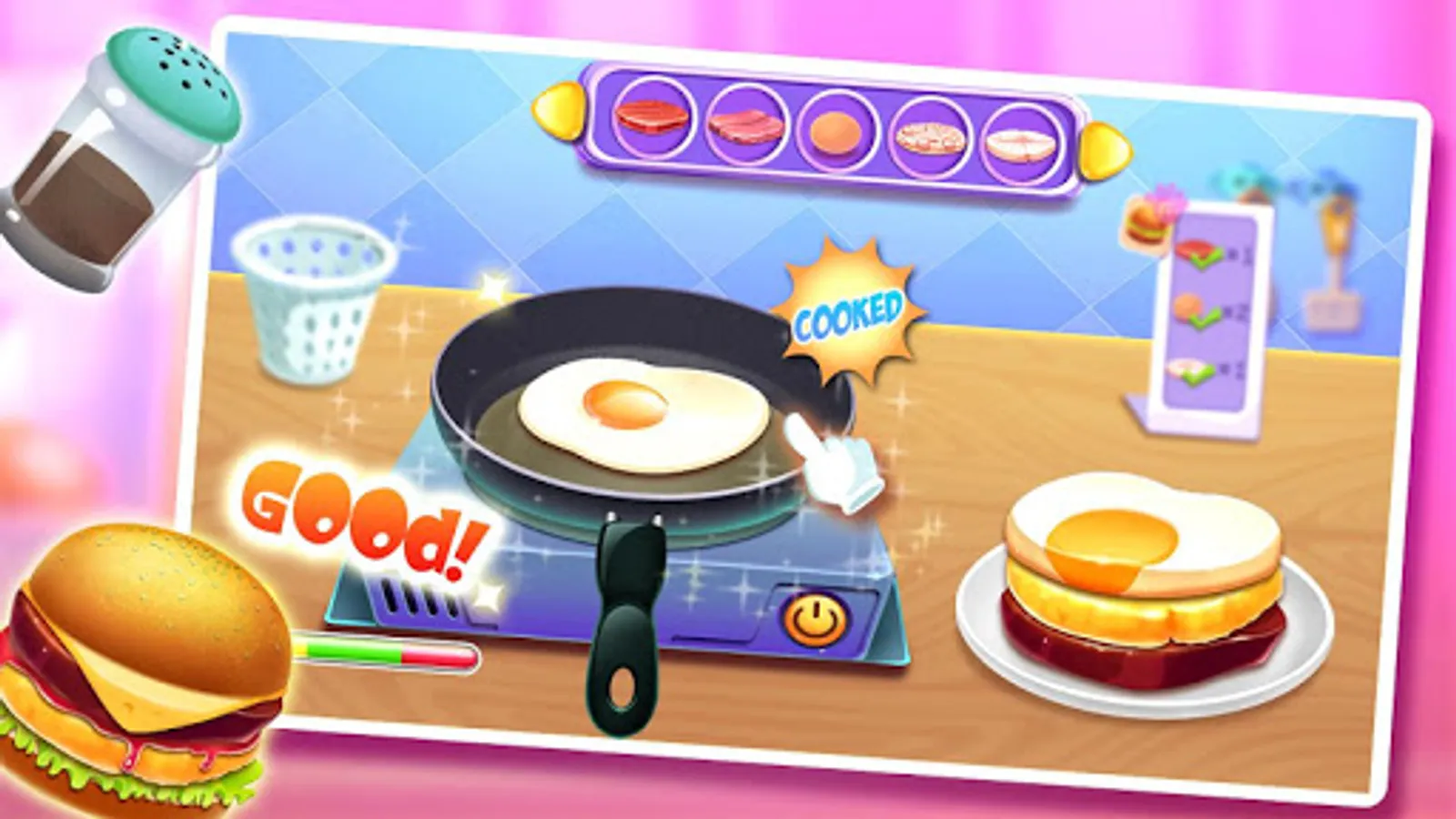 The popular hamburger shop is going to open in your city. Do you want to manage the hamburger shop and cook delicious hamburgers to customers?🍔 Decorate you hamburger shop and prepare the ingredients. Follow the recipe, bake hamburger bread, cook the meat and surprise your customers with tasty food!