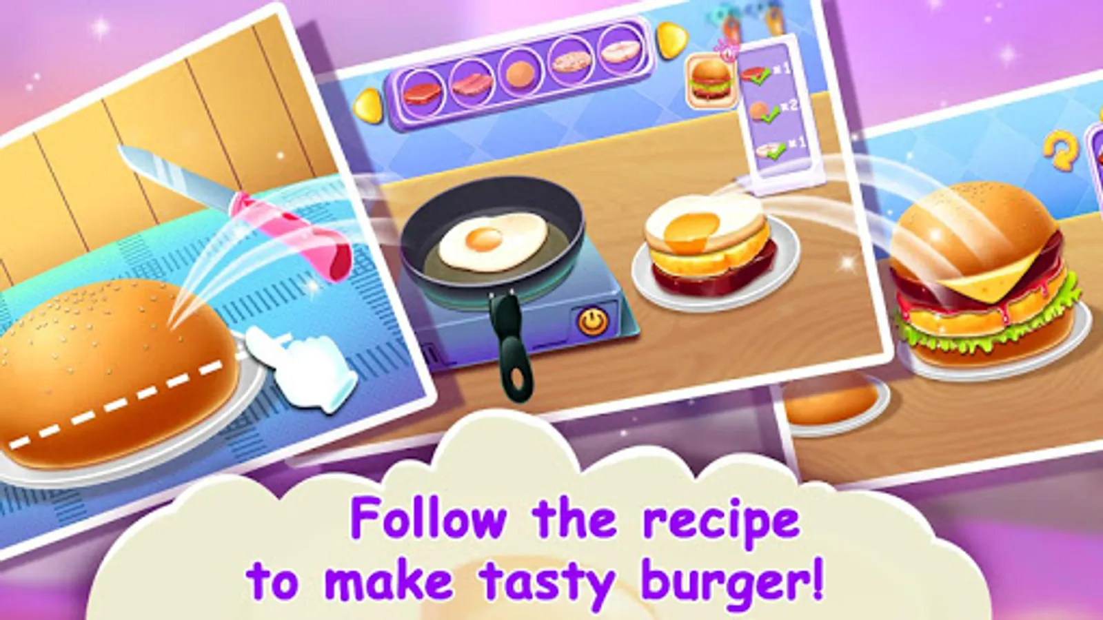 This hamburger cooking game will teach kids how to make hamburgers and how to manage a burger restaurant! Don’t let your customer wait too long. Let’s tap to cook!✌️✌️