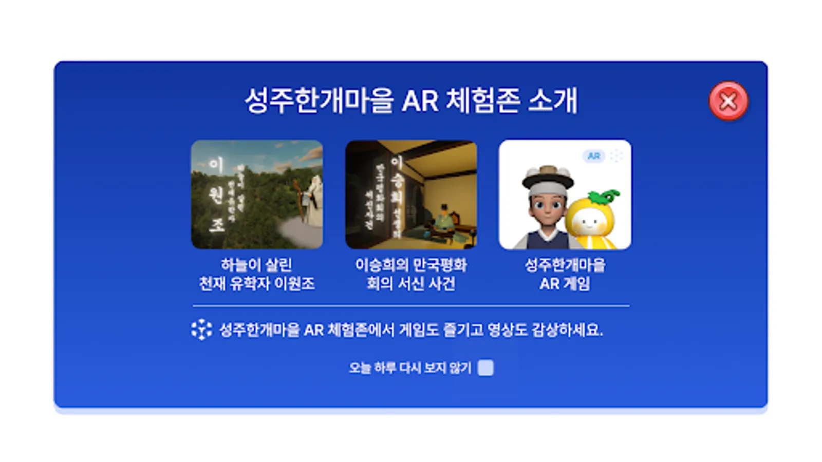 한개마을 스토리(AR)APP을 사용해 8개의 주어진 인터렉티브 AR 게임 및 스토리 미션을 해결하고 아이템을 획득하면서 마을의 중요한 장소들을 관람하는 콘텐츠