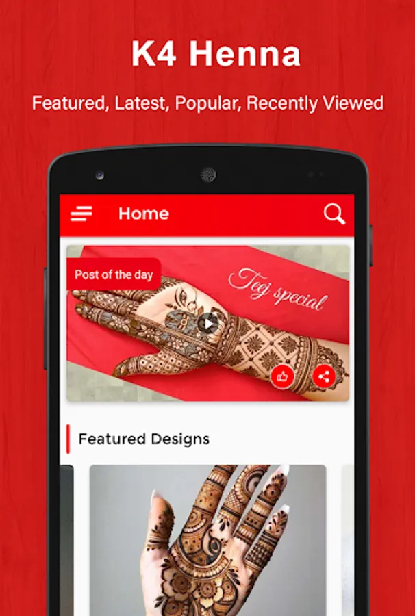 “K4 Henna - Mehndi Designs & Video Tutorials’' contains modern and traditional mehndi designs and tutorials for hands, palm, feets, legs, neck, belly and tattoos. You will find Henna Mehndi Designs and video tutorials in Arabic, Rajasthani, Indian, Pakistani style among other modern and traditional styles. “K4 Henna - Mehndi Designs & Video Tutorials’' bring you the latest and updated collection of Mehndi designs & tutorials - Floral, Geometric, Mandala, Jewellery, Peacock among others.