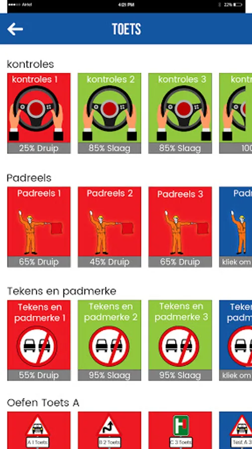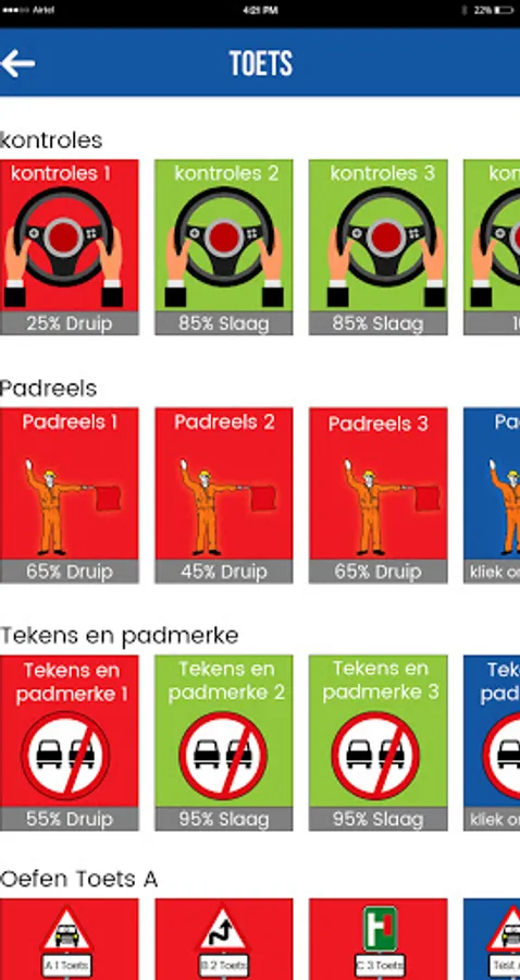 The scores are stored for the tests that allow the user to check their progress. The pass rate for the tests is in accordance with the requirements set by the Traffic Department of South Africa. The pass mark for controls is 6 out of 8. The pass mark for Rules of the Road is 22 out of 28 and the pass mark for signs and road markings is 23 out of 28.