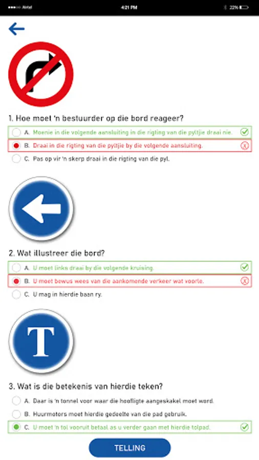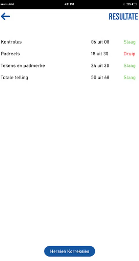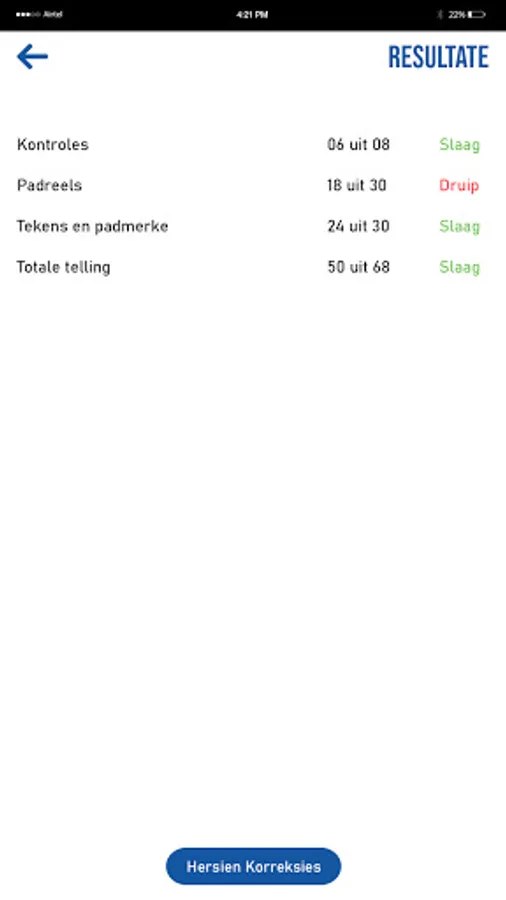 Finding your progress is easy on the K53 learner license app. Scores and corrections are available for each of the tests taken.