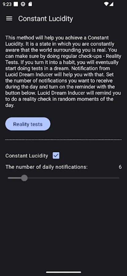 And it's not all! Lucid Dream Inducer also has a feature known as Constant Lucidity. Set it to receive random notifications that will remind you to do a Reality Test. First step to achieve Lucidity in your dream is to stay Lucid throughout the day.