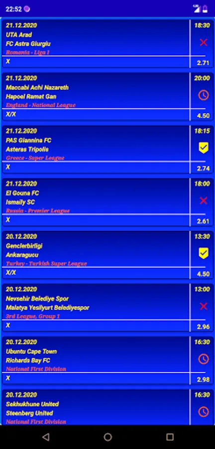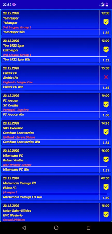 The system works totally automatic. Betting tips of the day are added to the system every day at 8 am. Before adding the betting tips to our application, all matches played in the last 5 years, all scored and conceded goals and even yellow and red cards are analyzed.