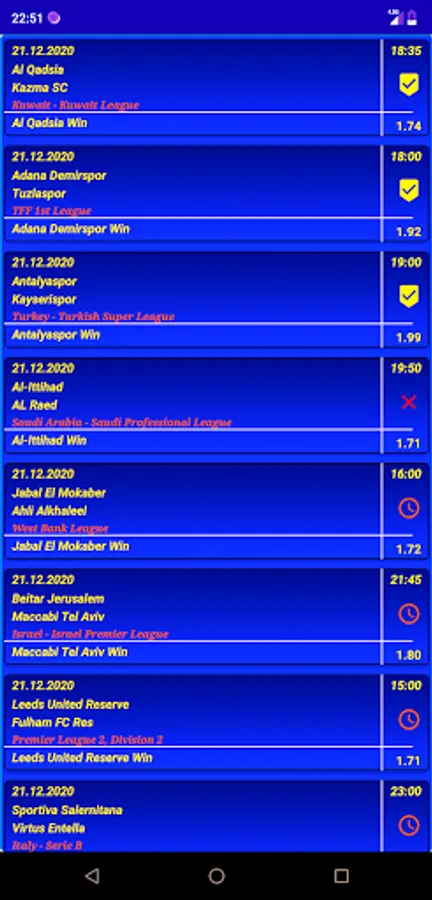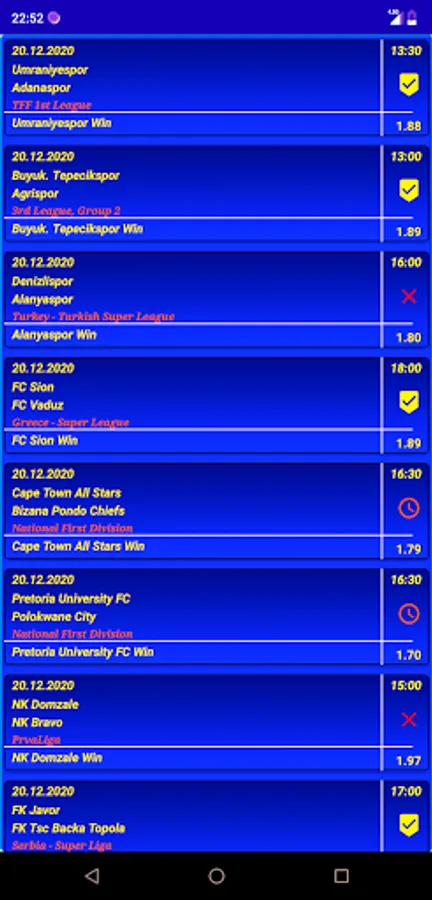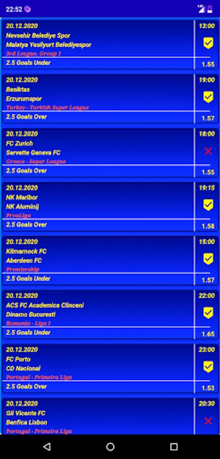 Our application which contains 6 different betting tips, works with an artificial intelligence system. Daily published all competitions are rated according to specific statistics. After the rating, betting tips (football) with the highest chance of win are add to the related category.