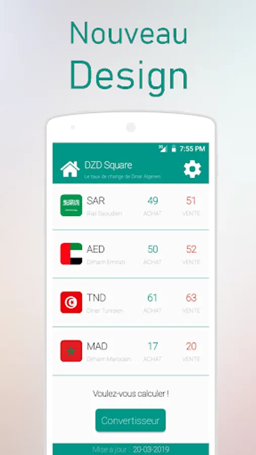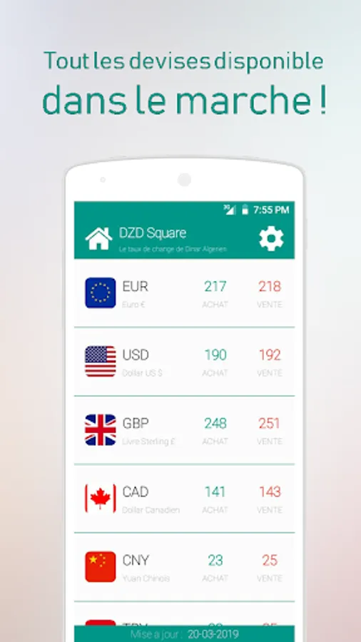 Euro US Dollar ,Canadian Dollar ,Pound Sterling ,Chinese Yuan ,Turkish Lira ,Swiss Franc ,Saudi Rial ,Emirati Dirham ,Tunisian Dinar ,Moroccan Dirham.