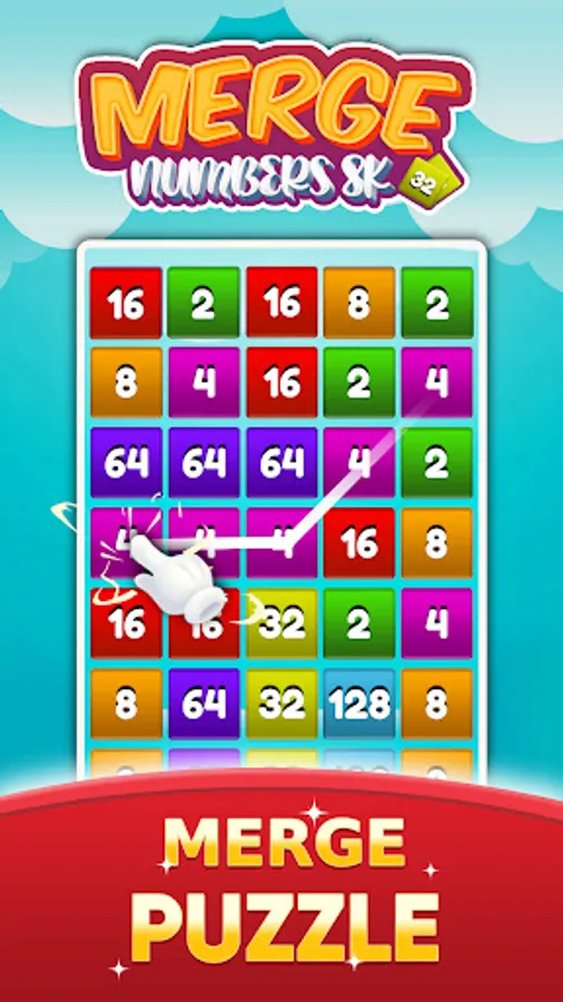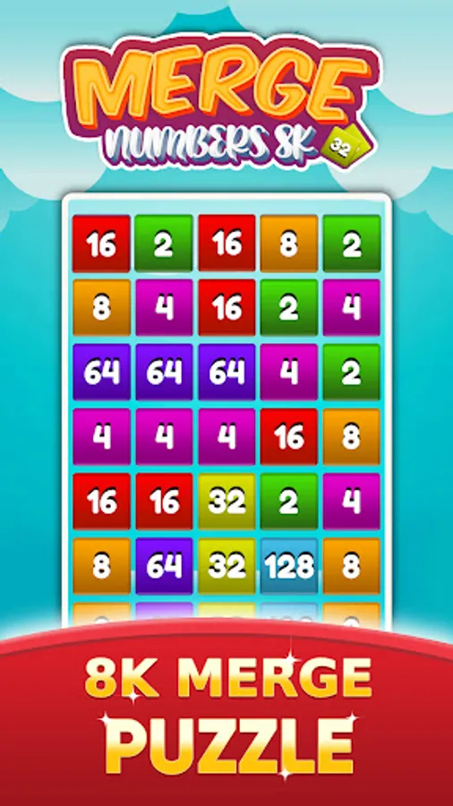- Swipe or drag the same numbers (2-2-2, 8-8-8-8…8, etc) in any 8-way direction to merge into higher x2 blocks until you reach the 8k number.
