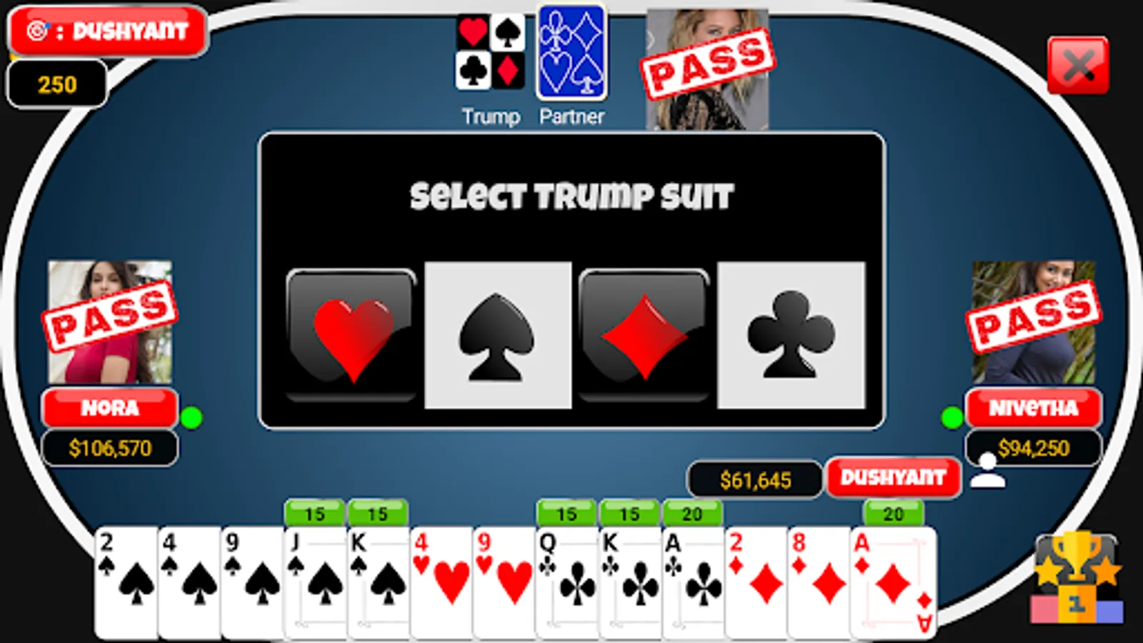 The player with highest bid gets to choose trump suit, and 1/2 partner cards (buddy) depending on total number of players.