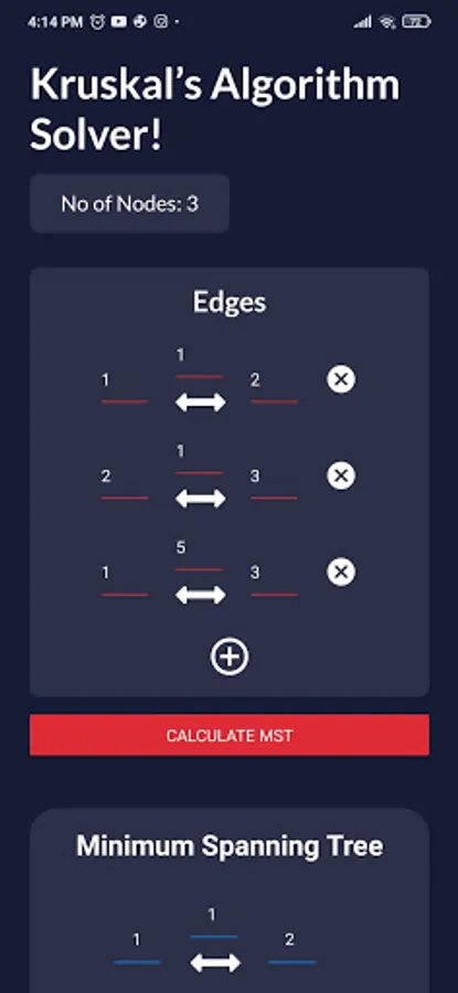 With Kruskal's Algorithm Solver, all you need to do is enter any valid set of edges and vertices, and you are good to go! A Minimum Spanning Tree will be generated for you.