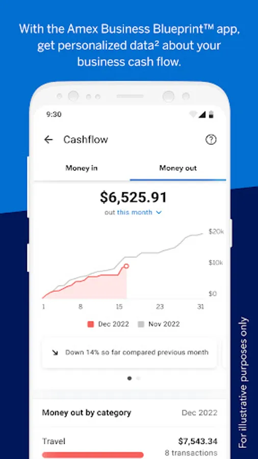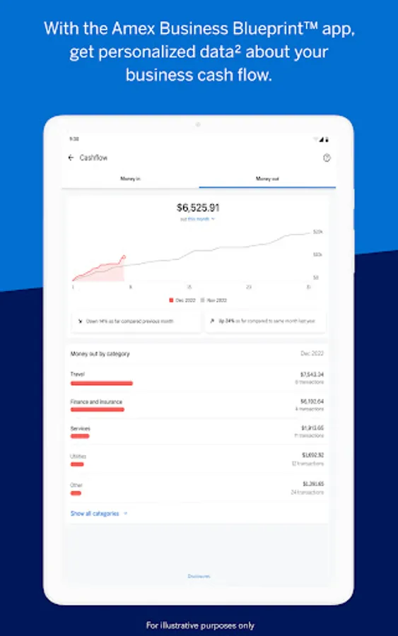 2. Data provided by My Insights, an Amex Business Blueprint™ feature, is based on customers’ select business products, which includes Amex® Business Line of Credit, Amex® Business Checking, Amex® Payment Accept, American Express® Business Credit Cards, and the eligible external business bank accounts that customers choose to link to Business Blueprint.