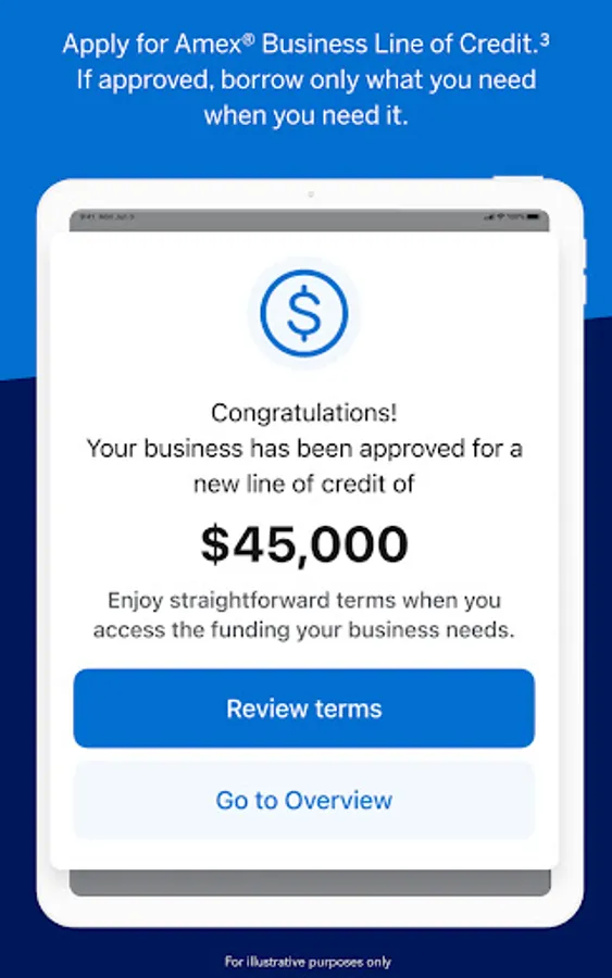3. Amex® Business Line of Credit offers access to a commercial line of credit ranging from $2,000 to $250,000; however, you may be eligible for a larger line of credit based on our evaluation of your business. Each draw on the line of credit will result in a separate installment loan. All loans are subject to credit approval and are secured by business assets. Every loan requires a personal guarantee. Total monthly fees incurred over the loan term range from 3-9% for 6-month loans, 6-18% for 12-month loans, 9-27% for 18-month loans, and are subject to change for future loans drawn under the available line of credit. Loans incur a loan fee for each month you have an outstanding balance. Not all customers will be eligible for the lowest fee. Not all loan term lengths are available to all customers. Eligibility is based on creditworthiness and other factors. Not all industries are eligible for Amex® Business Line of Credit. Pricing and line of credit decisions are based on the overall financial profile of you and your business, including history with American Express and other financial institutions, credit history, and other factors. Lines of credit are subject to periodic review and may change or be suspended, accompanied with or without an account closure. Late fees may be assessed. Loans are issued by American Express National Bank.