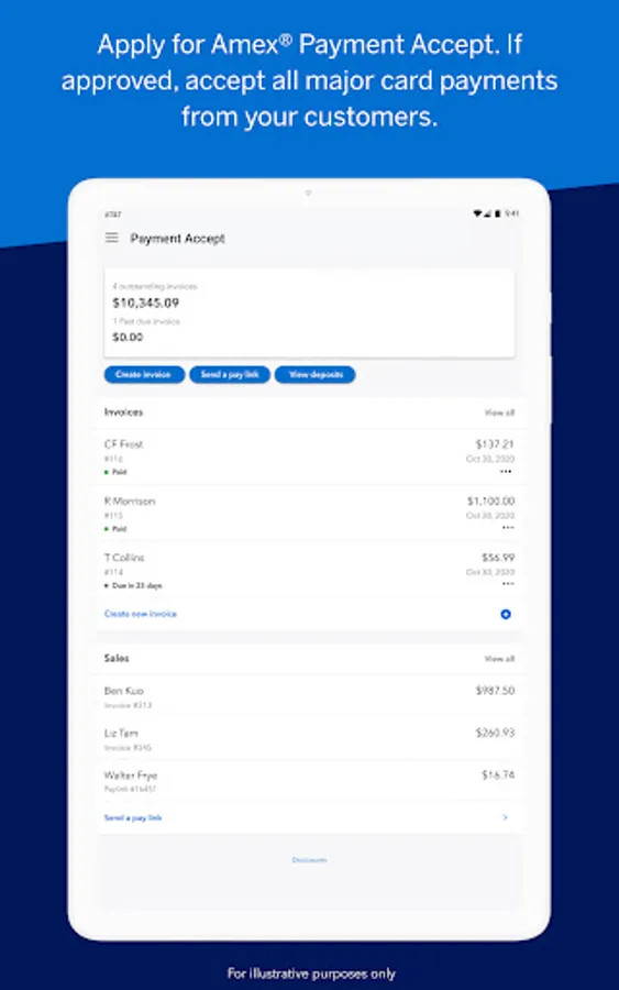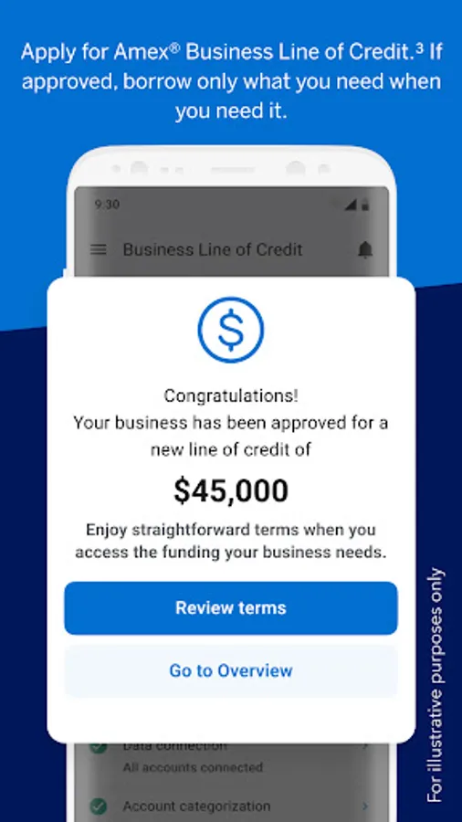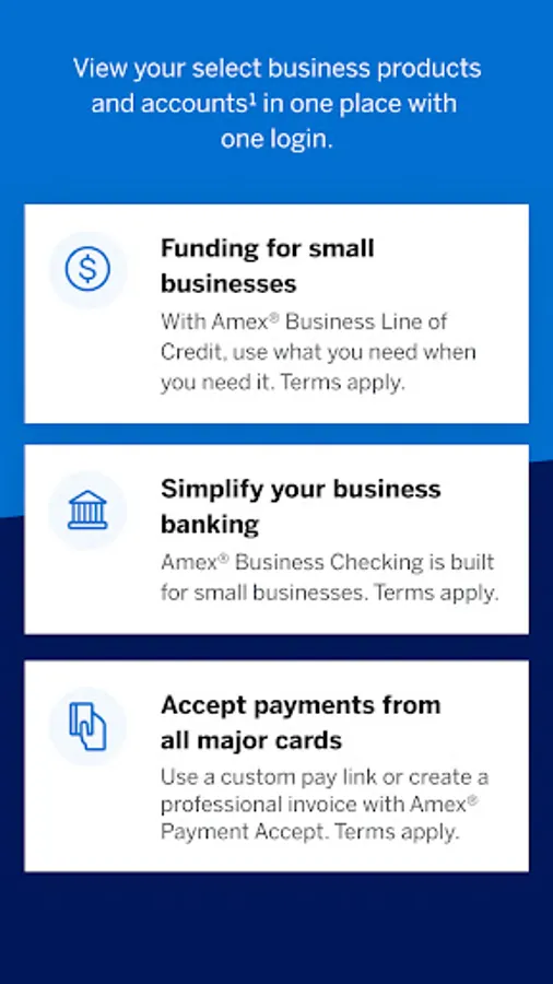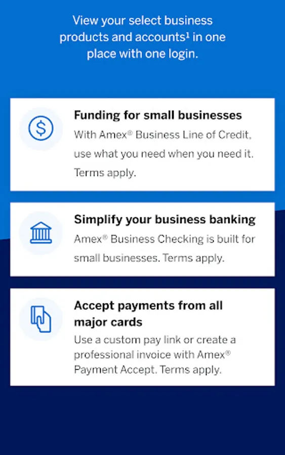 To log in, users must have an existing Kabbage or American Express User ID and password or create one. All access to and use of this app is subject to and governed by the American Express Privacy Statement, American Express Business Blueprint™ App End User License Agreement, and American Express Terms of Service. ©2023 American Express. All rights reserved.