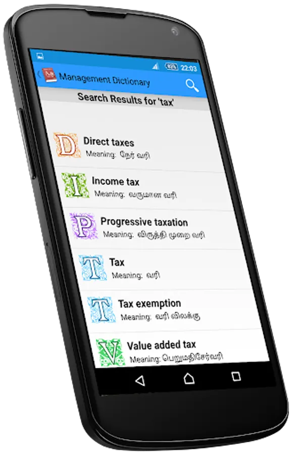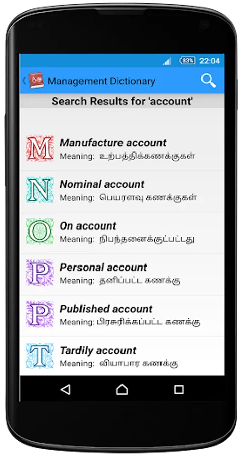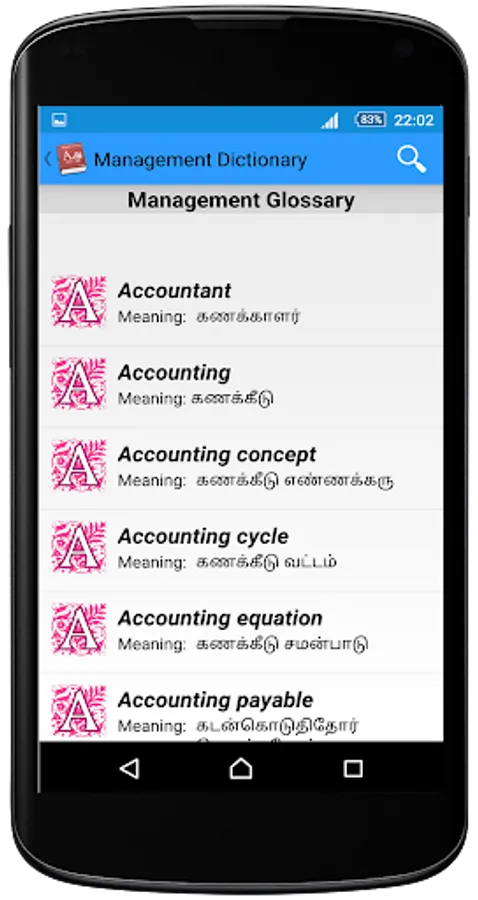The first app on Android which provides Tamil meanings 1000+ business or management related words.