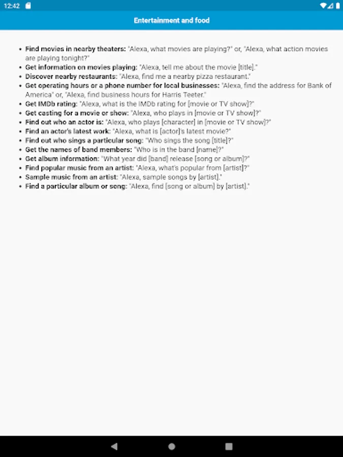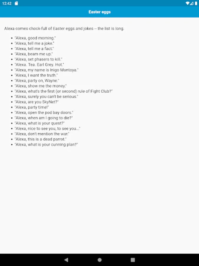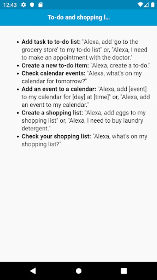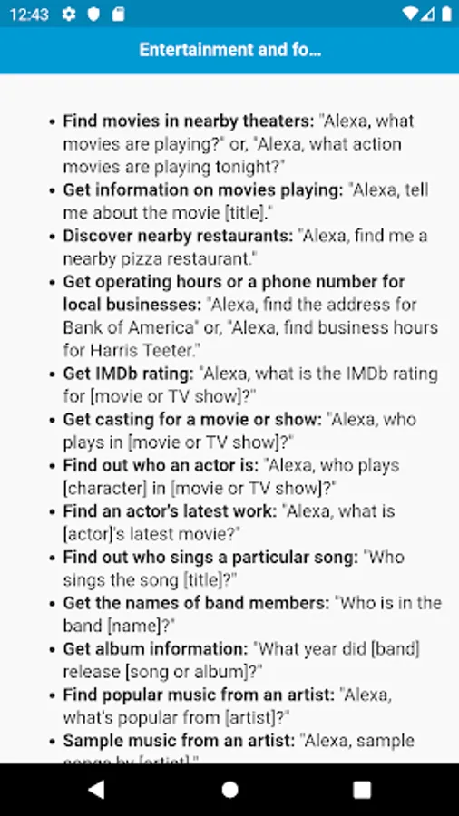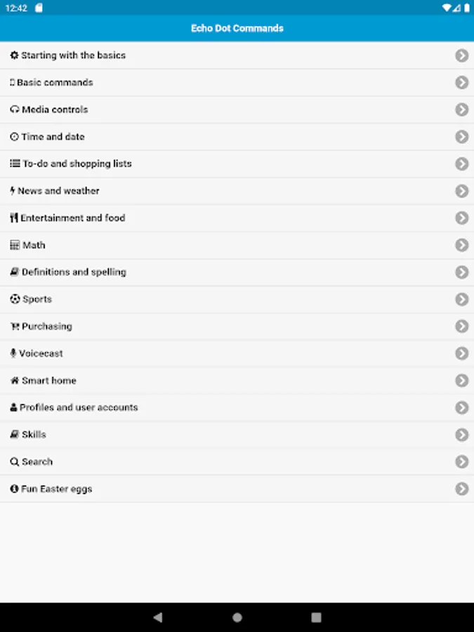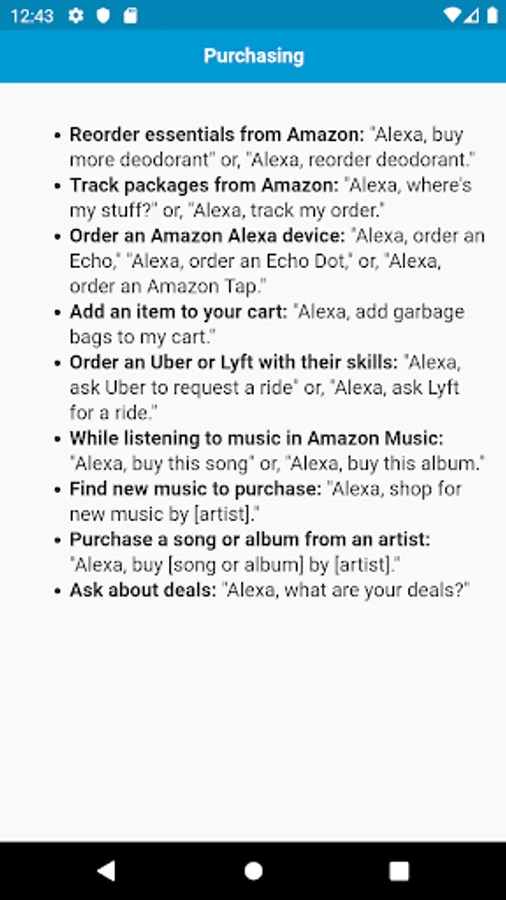 The complete list of Alexa commands for your Amazon Echo Dot. Alexa is a virtual assistant developed by Amazon. In this app, you will get all essential Alexa commands for your Echo Dot device.