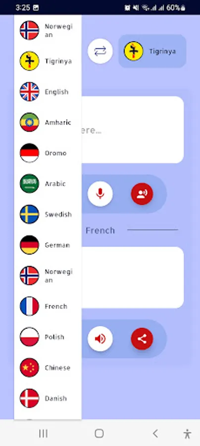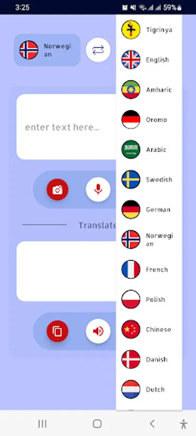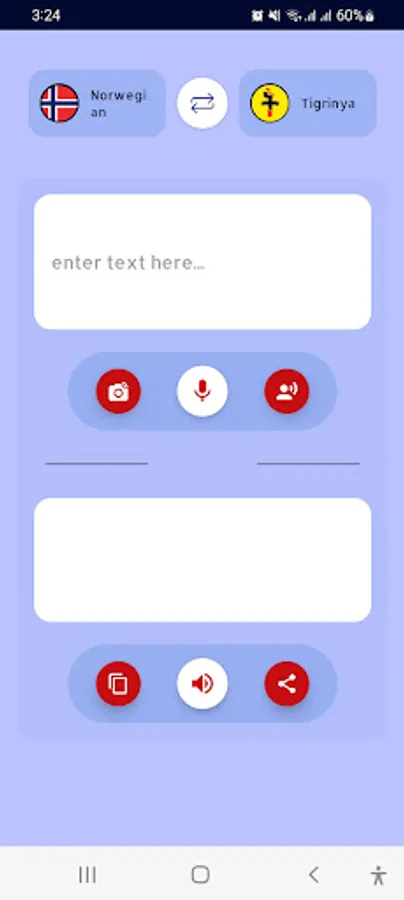 Norwegian Tigrinya translator helps you to communicate with other Tigrinya speakers online and offline. You can translate from and to Tigrinya, English, Amharic, and more than 20+ Language.