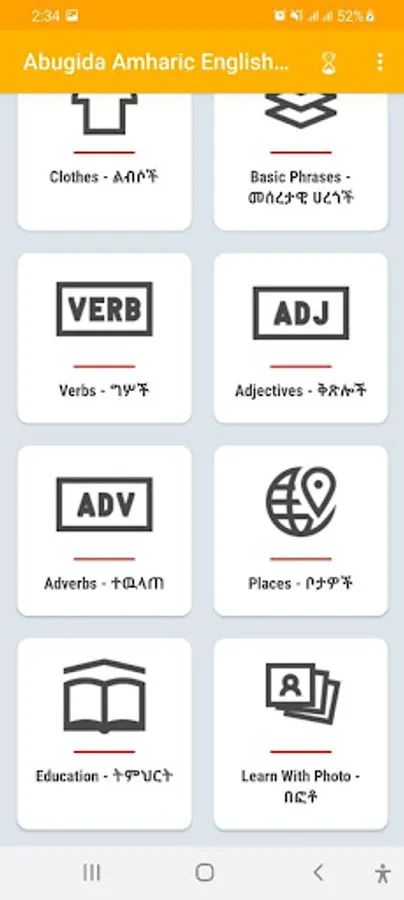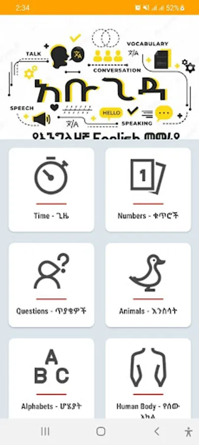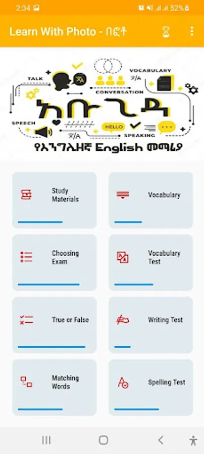 The app uses multiple language learning approach to teach the 4 language skills. The app has Flashcards, list of vocabularies and phrases grouped in concepts, Vocabulary practice tests, exercise tests for practicing Phrases, True or false questions, Writing practice tests, Matching words to digest the vocabularies, spelling test, Learning by pictures, and many more.