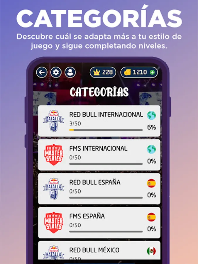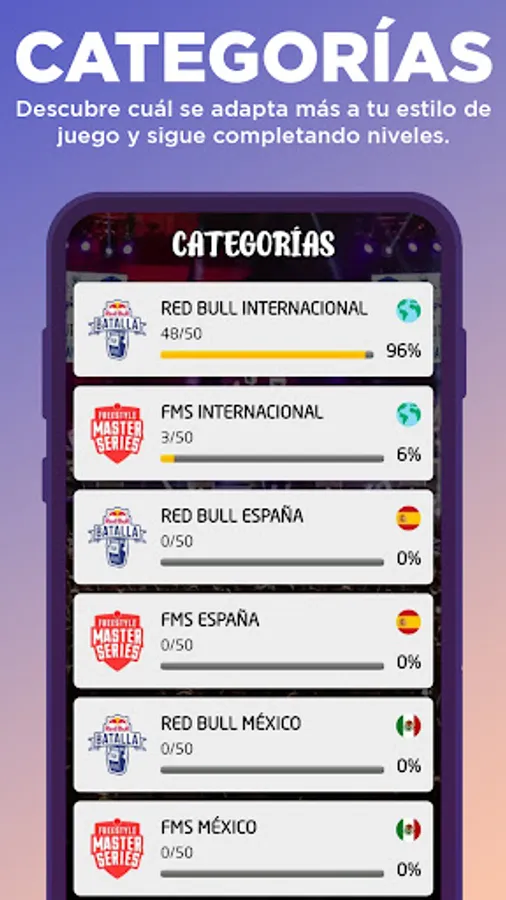 We have the most famous competitions in the world of Hip Hop Freestyle, such as: Red Bull Batalla de los Gallos and FMS, progressively we will add many more competitions such as the Fifth Step of Argentina, God Level, BDM and many more.