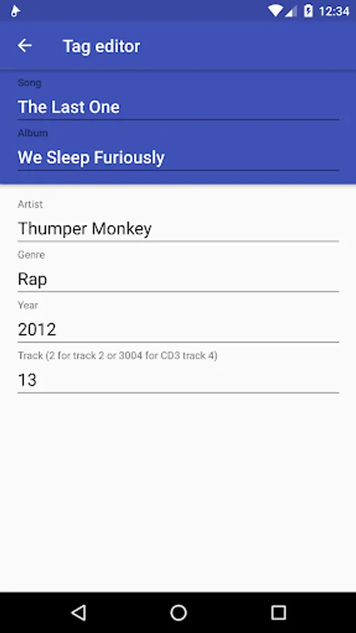 The tag editor allows you to easily edit the tags of your music files such as title, artist, album name (...) for single songs or whole albums. You can even either let Phonograph automatically download missing album covers for you (powered by Last.fm) or choose one from your internal storage.
