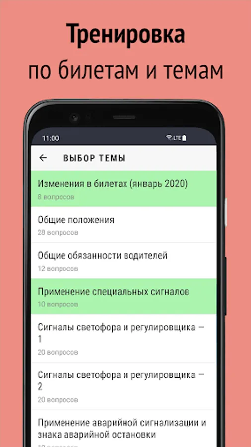 In addition, all questions are divided into topics. This allows you to immediately start training after passing a certain topic in courses at a driving school.