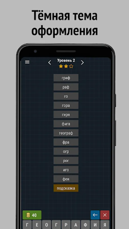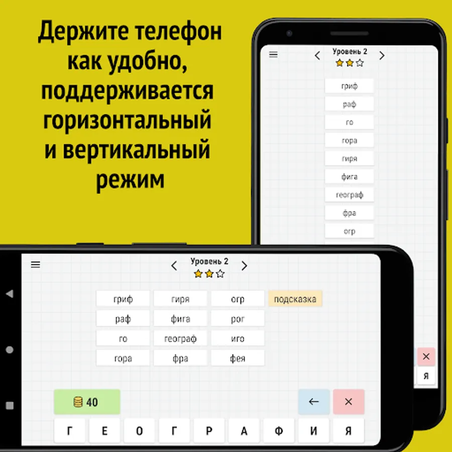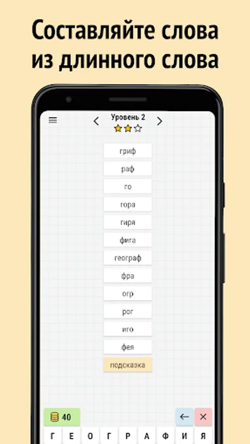 The puzzle is also known as "compositor", this game was played in the finale of the program "Finest Hour". The application will be of interest to fans of such games as "Balda", "Words from the word", "Make words", "Slovobor", "Slovodel", "Gallows", "Word Search", as well as those who like to solve crosswords, crossword puzzles and rebuses.