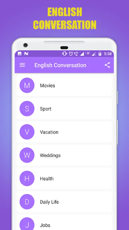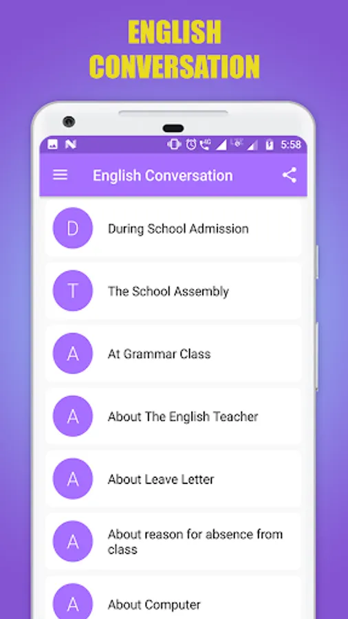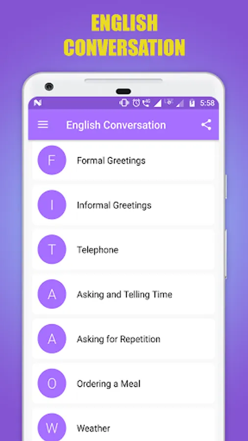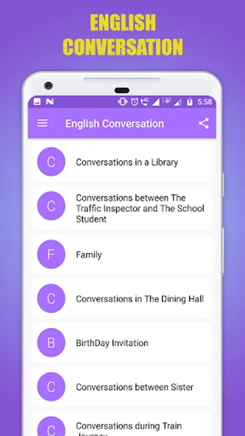 This app contains all English Conversation related to daily activities. English Conversation app contains the following conversation -