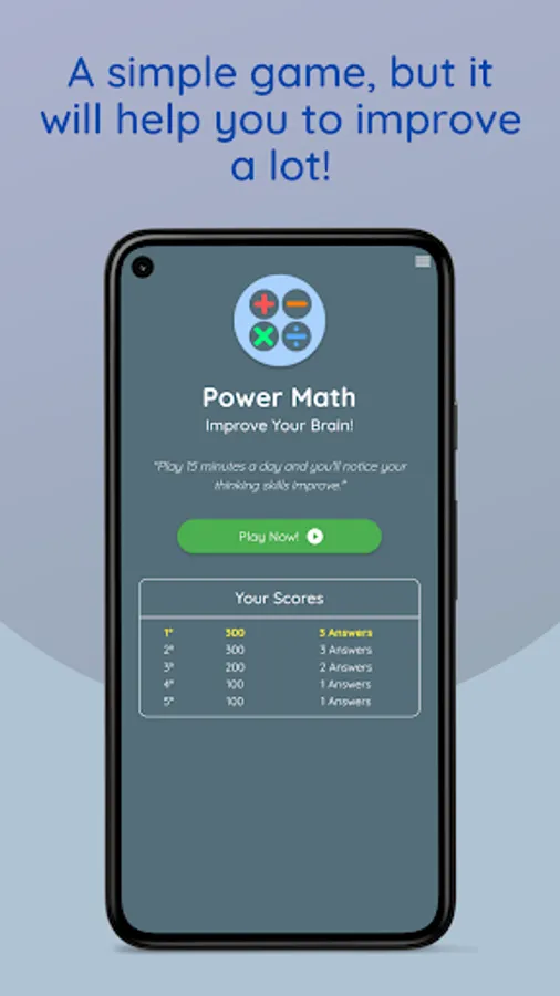 In Math Games: Power Brain, your goal is to calculate as many math expressions as possible within the time limit, beat your record every day and you will notice an improvement in your reasoning and logic skills!