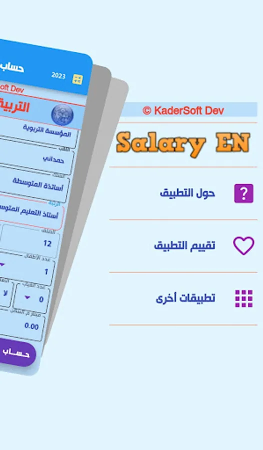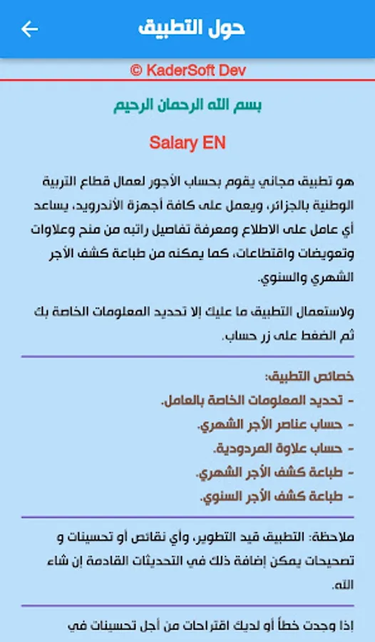 The app will be subject to improvement and add other features in upcoming updates, and if you find a bug or have any suggestions to improve the Salary EN app, please contact us at kadersoft.dev@gmail.com, or leave a message on Google Play, thank you.