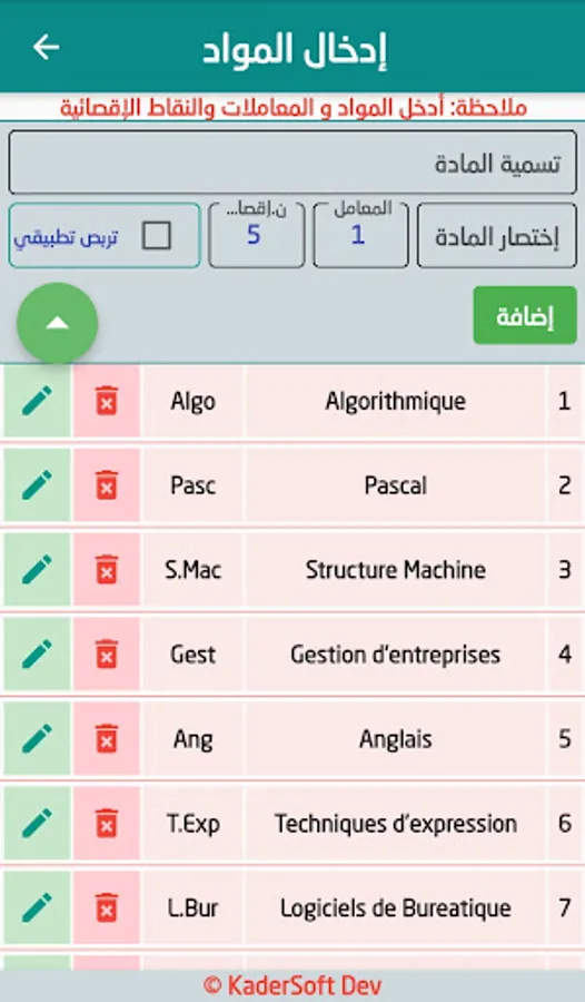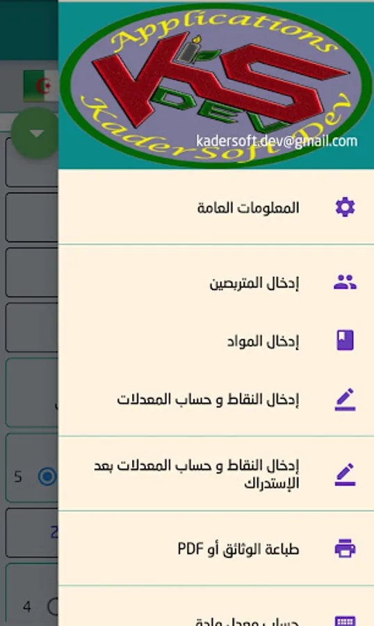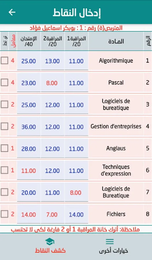It is an application that calculates rates, displays and prints results, and works on all Android and Windows 64-bit devices, and its goal is pedagogical. Easily and simply to use, and each user only has to enter the data of the stalkers, the studied materials, the transactions and the exclusion points, and then fill the points (marks) of the stalkers obtained in the assessments and exams during the six months.