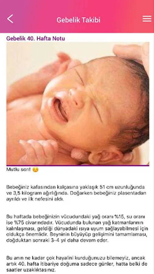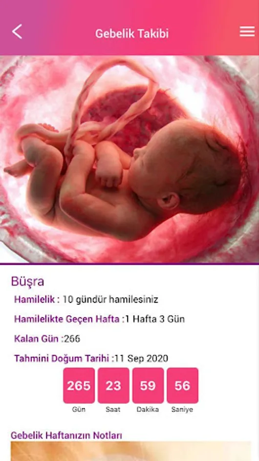 Pregnancy calendar is a special option only for those who choose the category pregnant. It calculates your pregnancy week based on the last menstrual period you entered in this field, which you can use as a pregnant calendar, gives you tips about your baby's weekly measurements and tells you what is waiting for you in advance. Of course, the answer to the question of how many days is left before birth is always ready.