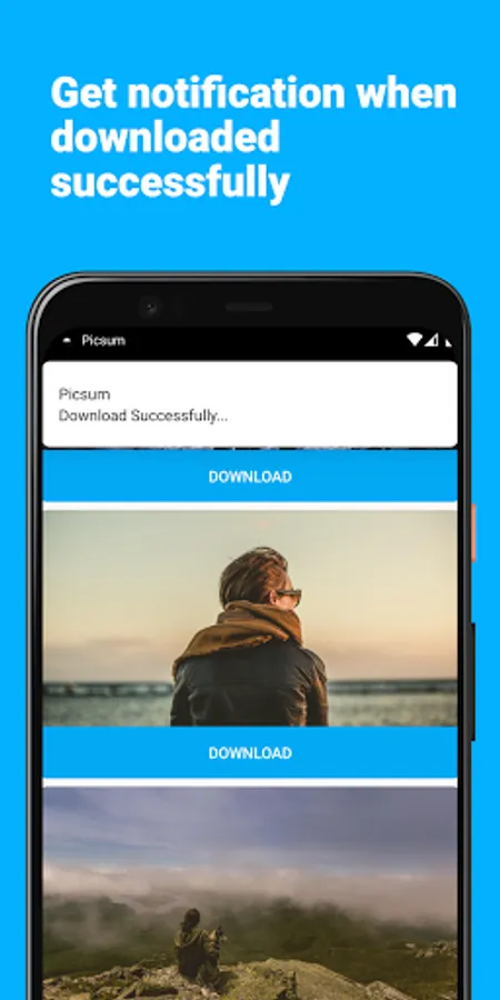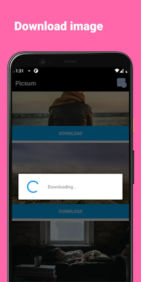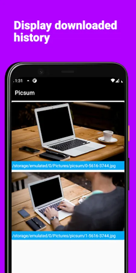Using free images API you can download images and show downloaded history. Also, you can reach the downloaded phone on your Photos app.