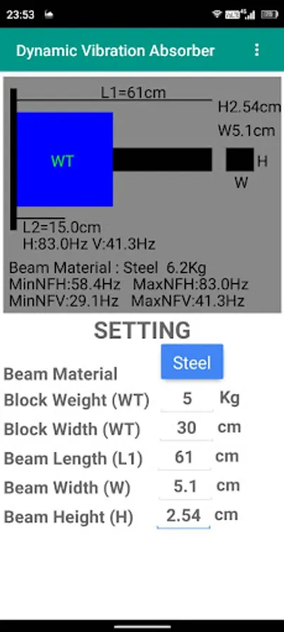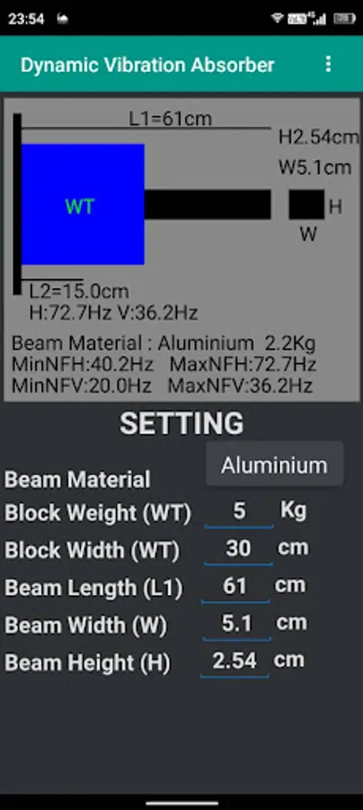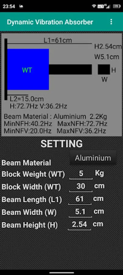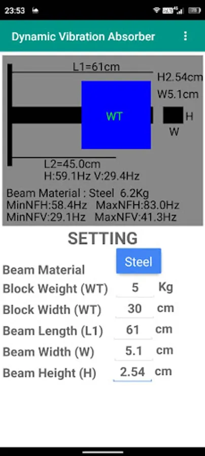 User can specify beam length, width and height, and also weight and material used for the beam to determine range of frequency that can be countered by the DVA. User can play with the graphic by moving the weight image by sliding to left and right to see the changes of the frequency. The range of frequency calculated with this calculator may differ a little bit from actual design.
