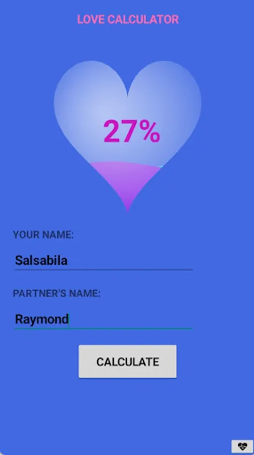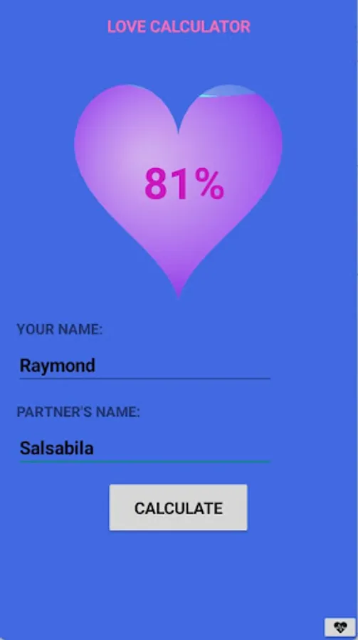 This is a Love Calculator just for fun and entertainment. I create this to do programming exercise. Algorithm used in this calculation can be searched in the internet. Recursion technique is used to make simple and short coding.