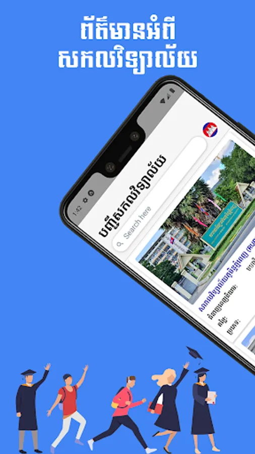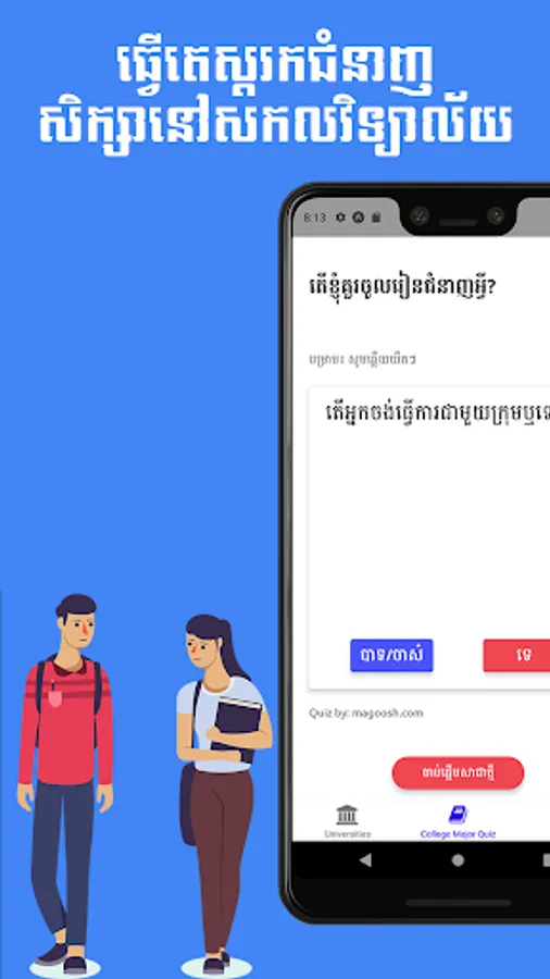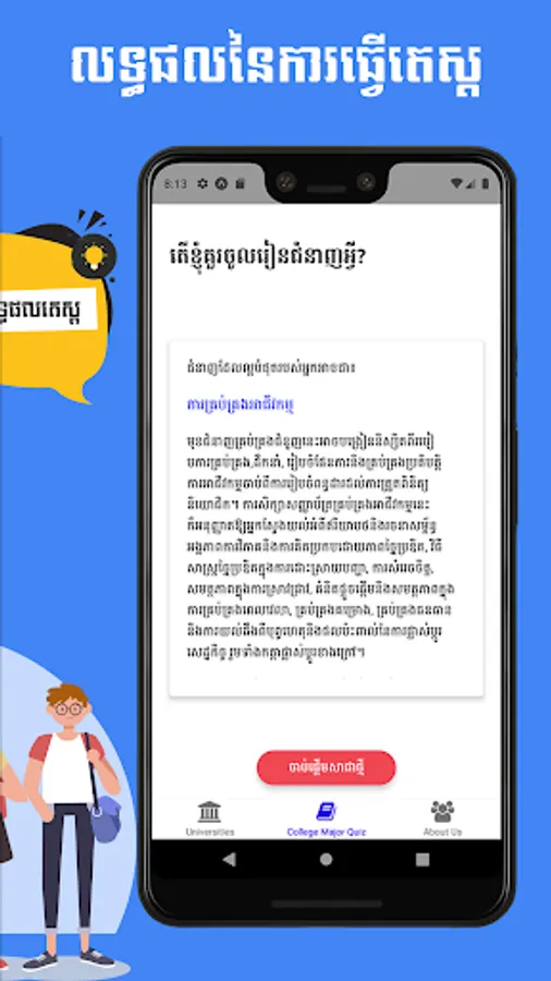 Kado Edu has two main features. First, we have a listing of information of a lot of universities in Phnom Penh for high school graduated students to easily find information about their dream university. The second main feature, we have "What Should I Major In?" which is a college major quiz for students to guess what major they should be studying in the college after their high school graduation.