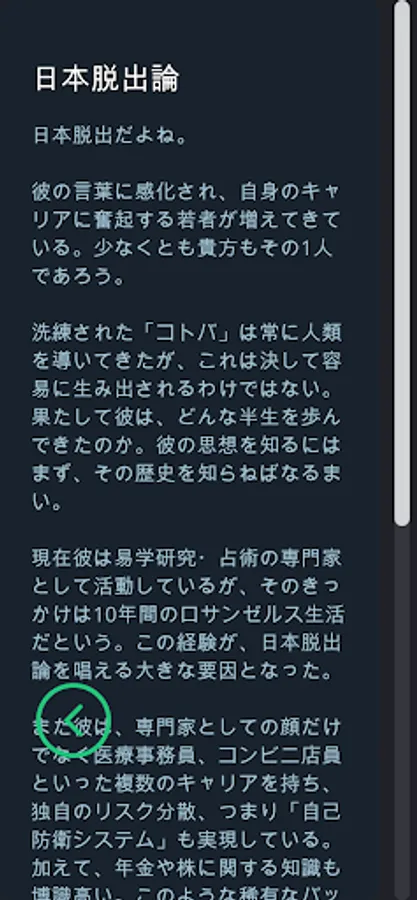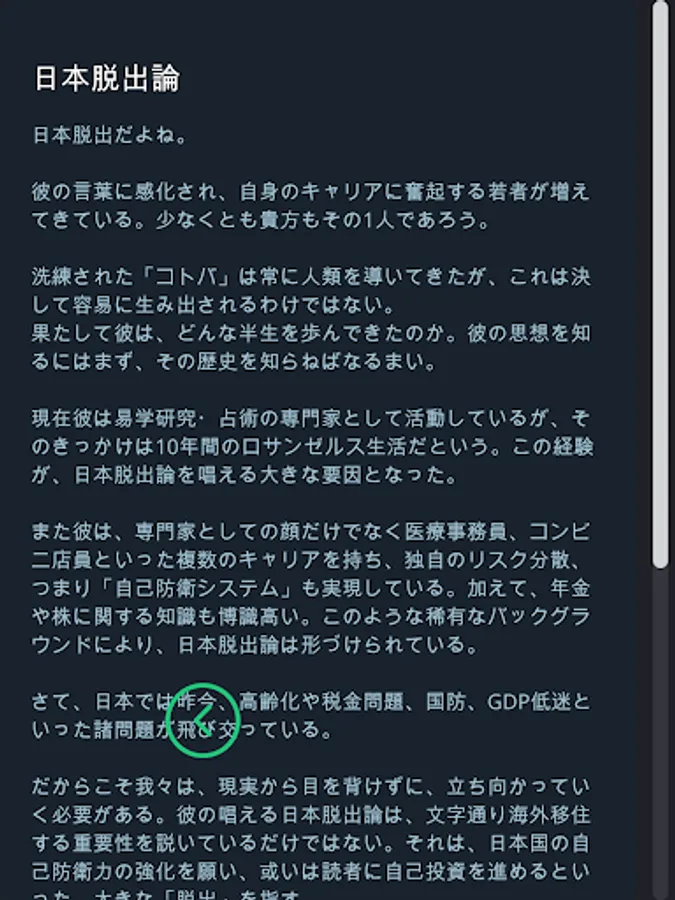 This is why we need to confront these issues and not turn our eyes away from reality. The theory of escape from Japan that he advocates does not stop at literally "preaching the importance of moving abroad. It points to "escape" in a larger sense, either by wishing to strengthen Japan's self-defense capabilities or by urging readers to invest in themselves.