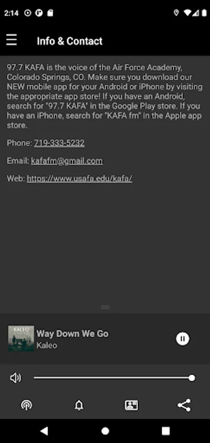 97.7 KAFA fm is the voice of cadets to the Colorado Springs area and now the world! We play today's best, alternative rock and offer special Academy programming like Character Matters with Chief Vasquez, The Lunchtime Rewind with DJ Magic and Full Throttle with Boston Joe. We also cover many important Academy events like Falcon sports, cadet In-processing, Graduation, BCT updates and more.