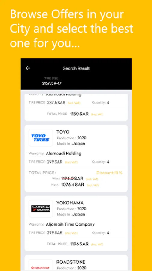 Estbnh App helps you find the best tires for your car at the best price. Simply enter the tire size you need and Estbnh will show you the latest offers from tire providers in your city. Pick a tire and have it delivered to one of our approved install centers near you, where you can go and install your brand-new tires.