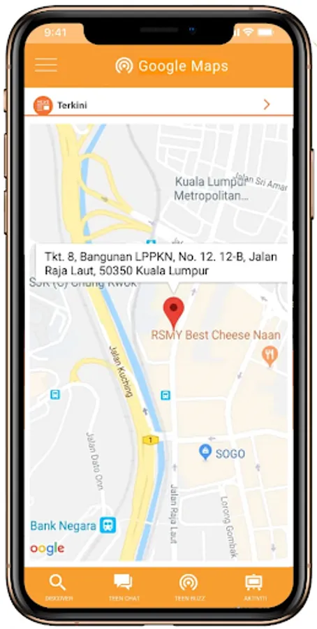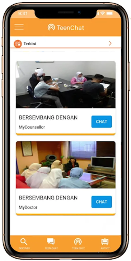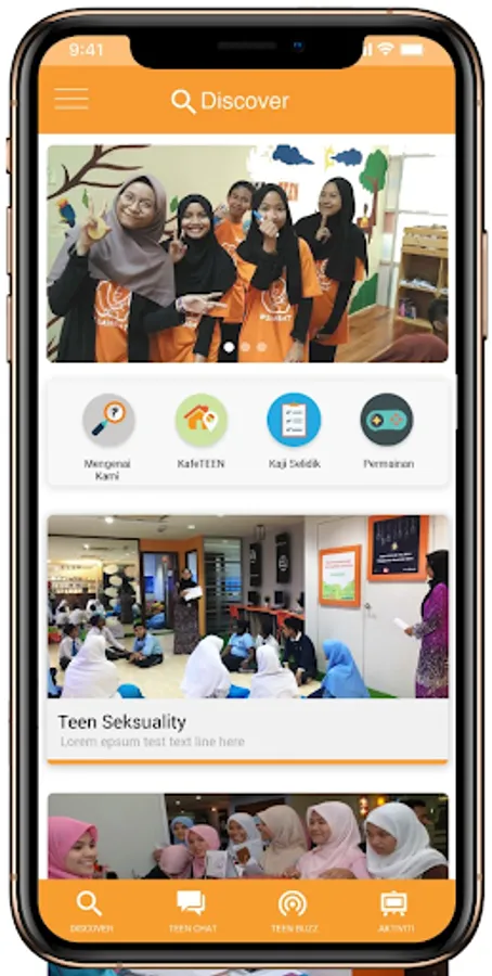 The app features TeenBuzz, TeenChat, TeenInfo, Sahabat, Kafe Location, Survey, and etc.